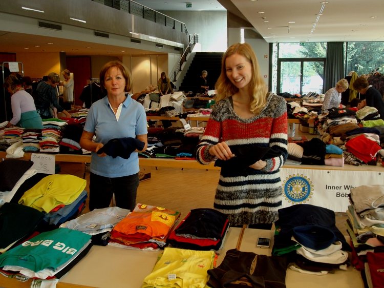 Am 7. Oktober ging es frühmorgens in der Kongresshalle los: Tische und Ständer wurden aufgebaut und bestückt. Ein fröhliches Miteinander begann und das Ergebnis ließ sich sehen: Hosen, Kleider, T-Shirts, Anzüge, Mäntel und Krawatten – von allem ganz viel und für jeden Geschmack ein bißchen was. Bettwäsche, Geschirr und Schnickschnack von edel bis gewöhnungsbedürftig, aber gut in Schuss und preiswert. Und dazu noch Gürtel, Schuhe, Tücher und Taschen. Am Dienstagmorgen um neun war der erste Ansturm zu bewältigen. Alle Freundinnen und ihre Helferinnen hatten ihr Wechselgeld in Gürteltaschen parat, standen an den ihnen zugeteilten Tischen und die bange Frage: Werden die Kunden auch kommen, hat die Werbung funktioniert? klärte sich innerhalb weniger Minuten. Sie kamen und kauften. Manche freuten sich über das Wiedersehen mit schon bekannten „Verkäuferinnen“. Wem die Füße wehtaten, der ging mal schnell einen Kaffee trinken oder ein Stück Kuchen oder einen Keks essen.