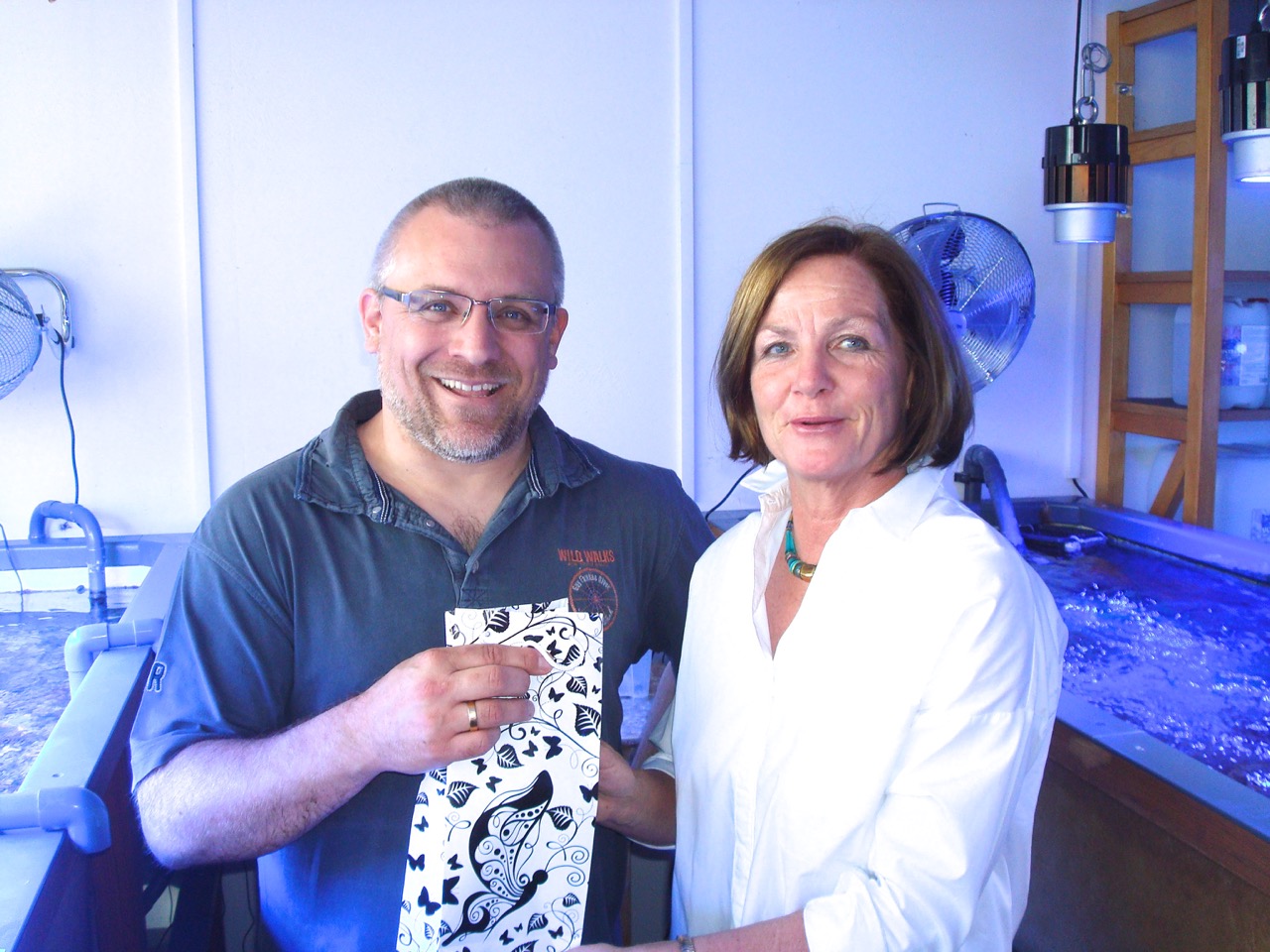 Nach der Begrüßung mit einem Glas Prosecco führt uns Claude Schuhmacher, der Firmeninhaber und Sohn unserer Freundin Marianne Schuhmacher in die faszinierende Welt der Meerwasser-Korallen ein. Mehrere Meerwasser-Becken mit vielfältigen großen, kleinen und farbenprächtigen Korallen sind zu bestaunen. Korallen – auch Blumentiere genannt – sind Nesseltiere, von denen weltweit ca. 22.000 Arten bekannt sind. Mit ihren kalkhaltigen Skeletten bilden sie die Korallenriffe, die teilweise so groß sind, dass sie einen bedeutenden physikalischen und ökologischen Einfluss auf die Umgebung haben.